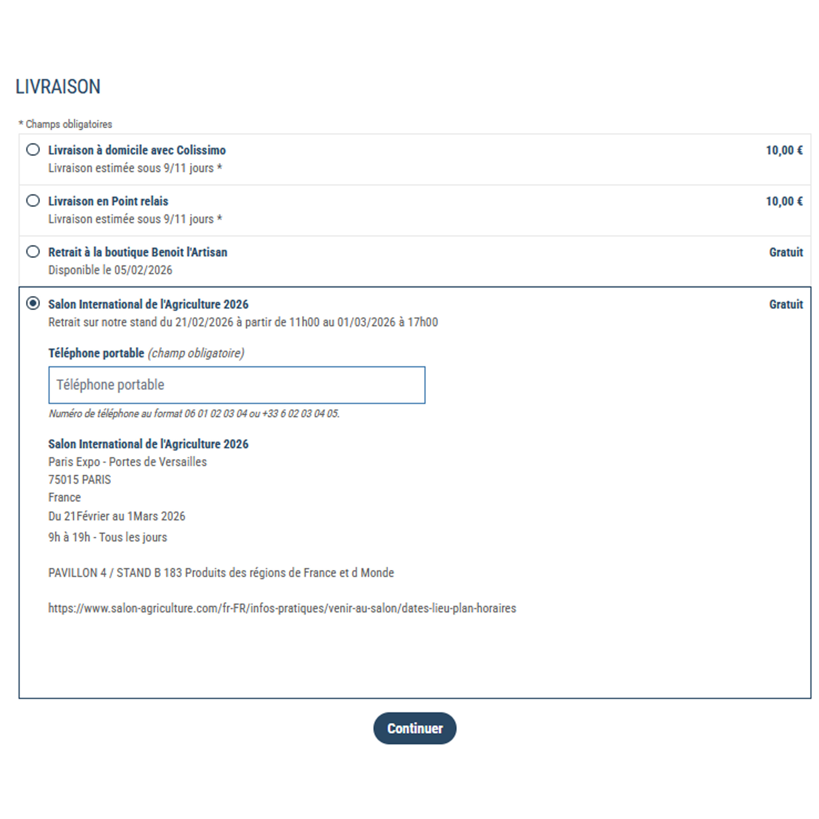 Pour cela, choisissez l'option de livraison "salon international de l'agriculture 2026" lors de votre achat.