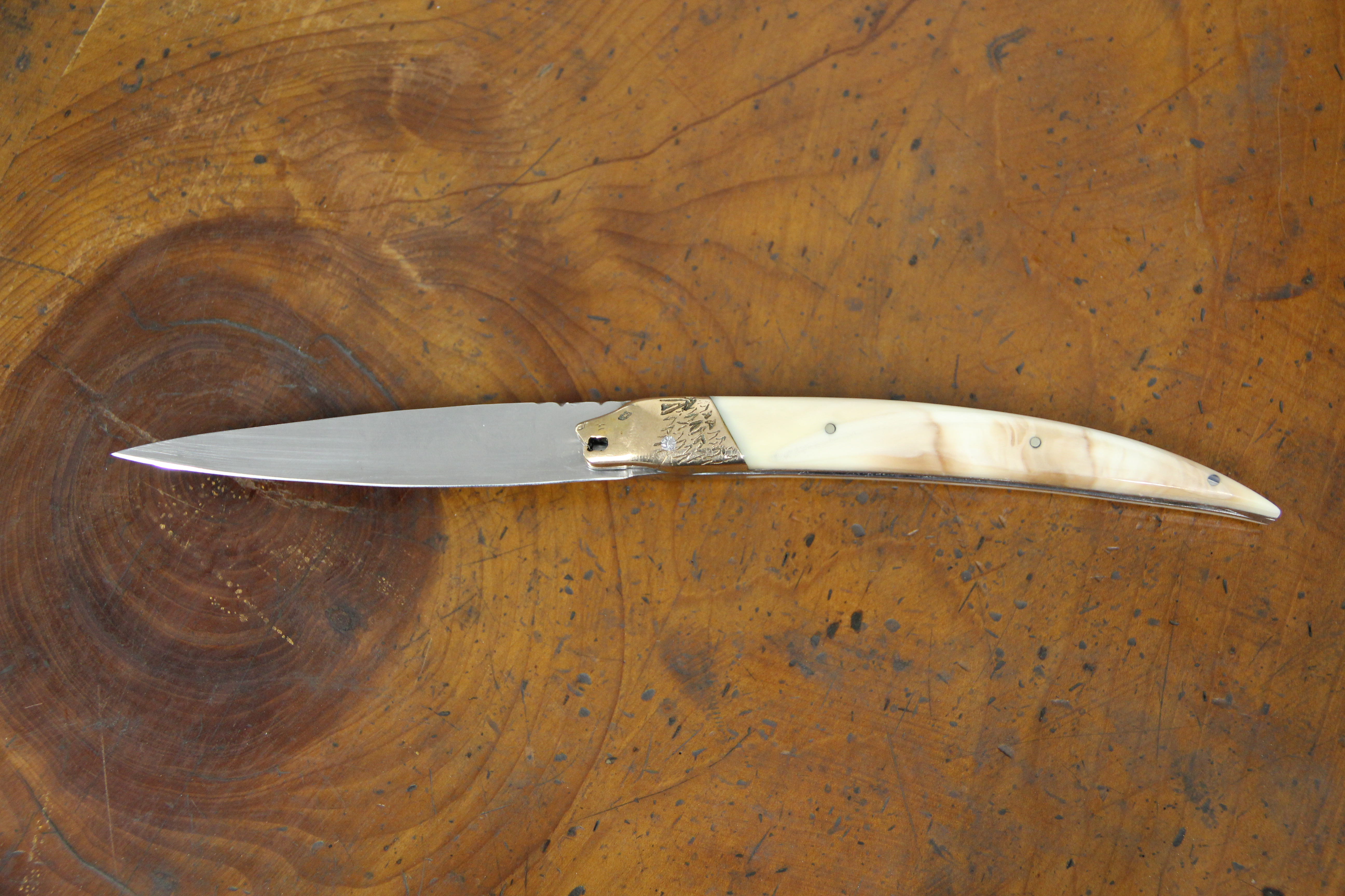 ➤ J’ai choisi comme couteau préféré un Laguiole pliant double platines, 12 cm, avec un manche en cœur de Mammouth, des mitres en inox brossées et une lame VG10. Je trouve intéressant que l’on fasse des couteaux avec à partir de l’ivoire d’un animal qui est très vieux et qui n’existe plus aujourd’hui. En plus, sur ce modèle, c’est le cœur de l’ivoire de mammouth, donc c’est tout blanc, alors qu’habituellement on fait des couteaux avec de l’ivoire de mammouth un peu plus bleue ou marron, ou bien avec de la molaire. Je trouve que ce couteau est super beau. »