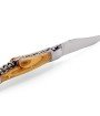 Ce couteau de Laguiole pliant avec tire-bouchon doubles platines est doté d'un manche de 12 cm en olivier, protégé par deux mitres inox. Le bois d'olivier est un bois noble, provenant du Sud de la France. Il est caractérisé par sa couleur beige et ses profondes veines brunes dessinant des motifs uniques sur chaque manche de couteau de Laguiole.