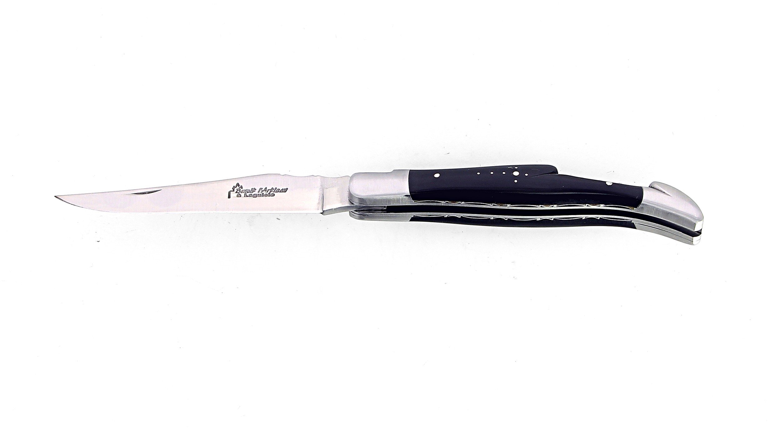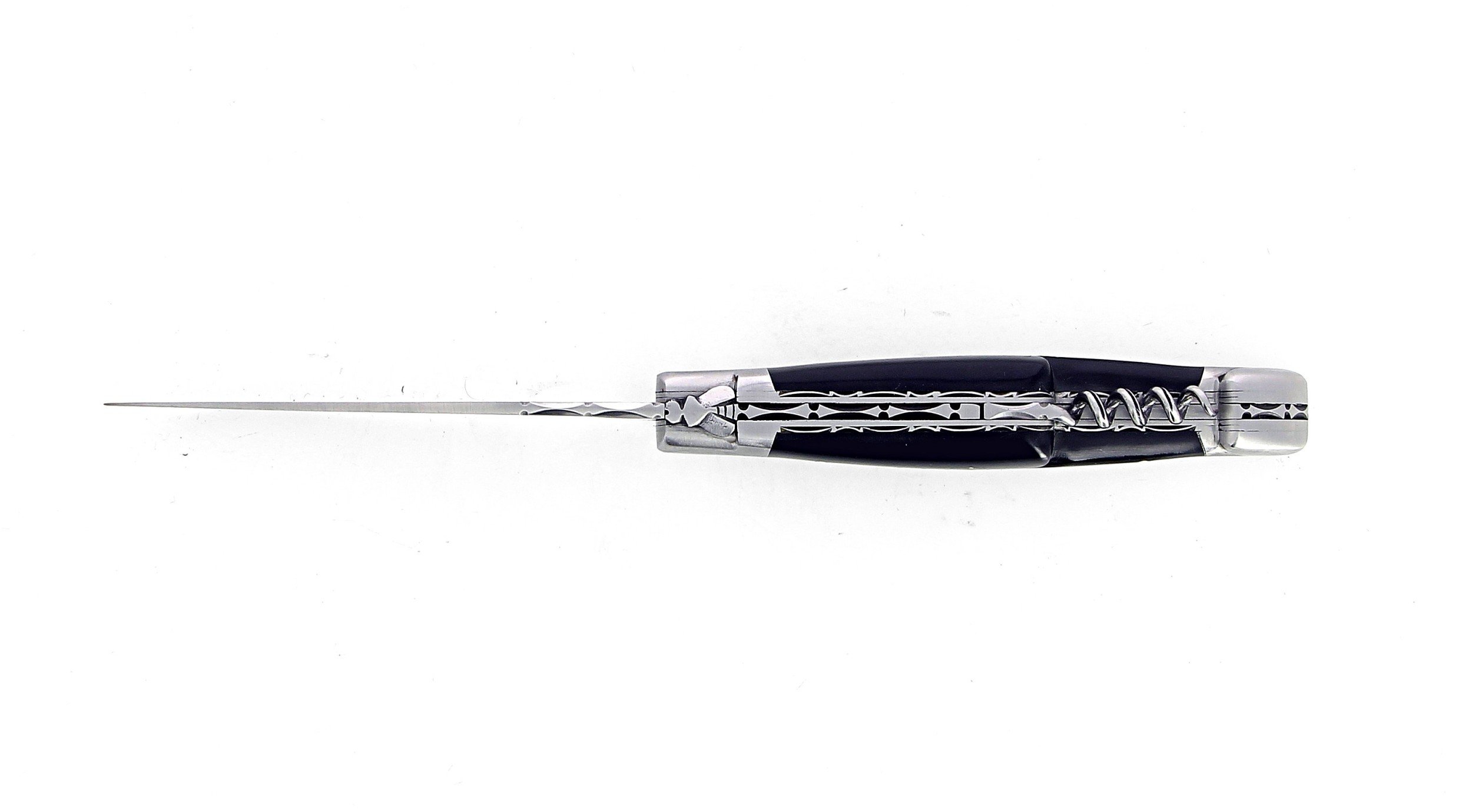 Ce couteau de Laguiole pliant avec tire-bouchon doubles platines est doté d'un manche de 12 cm en corne massive noire, protégé par deux mitres inox. La corne massive noire provient de la pointe de corne de buffle (partie pleine de la corne). Elle est caractérisée par sa couleur noire, profonde et homogène. L'intérêt de la corne de buffle réside dans son importante épaisseur, permettant de façonner le manche du couteau de Laguiole en plein dans la masse de la corne, pour une meilleure solidité.