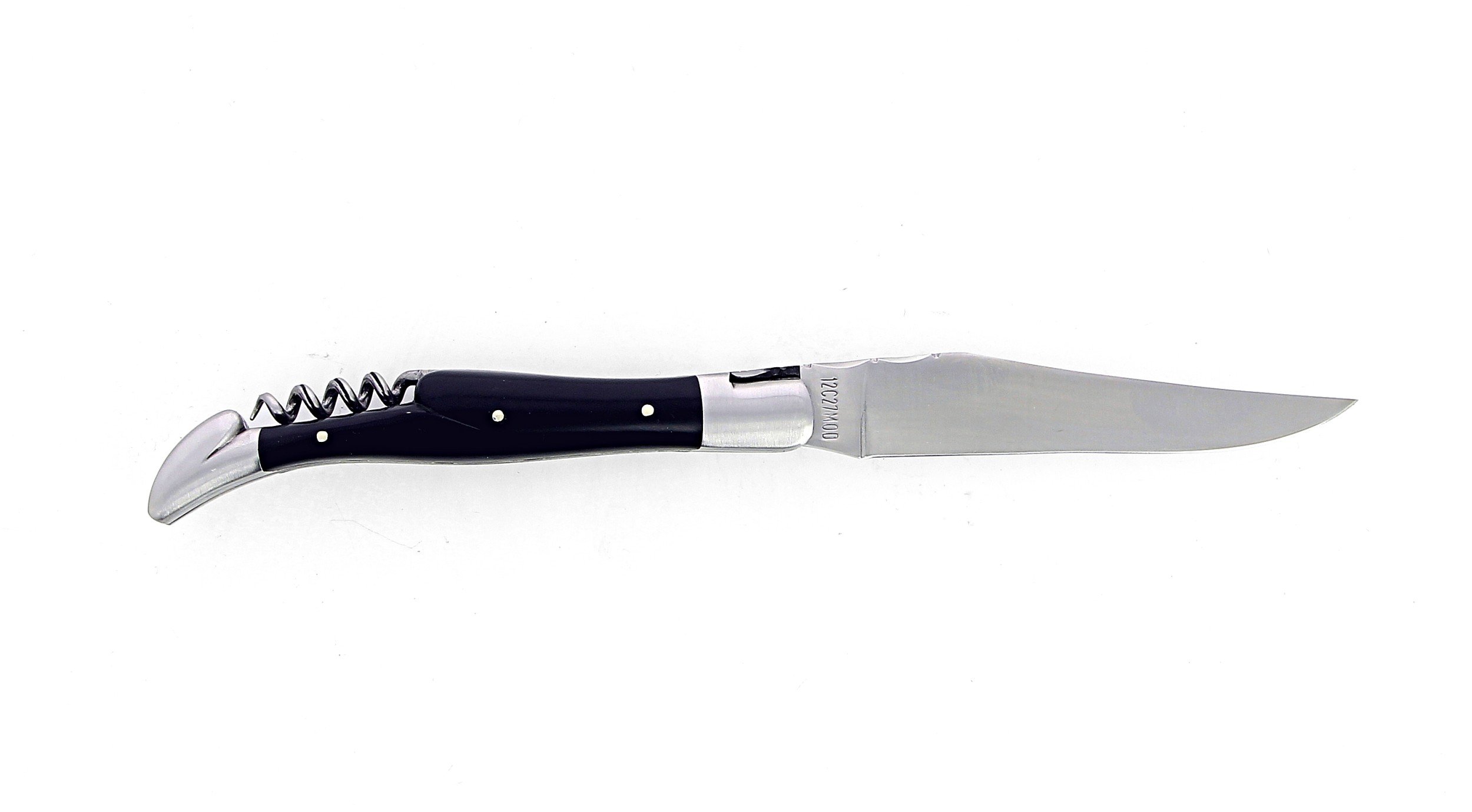 Laguiole pliant avec tire-bouchon, doubles platines, 12 cm, manche en corne massive noire, mitres inox brossé