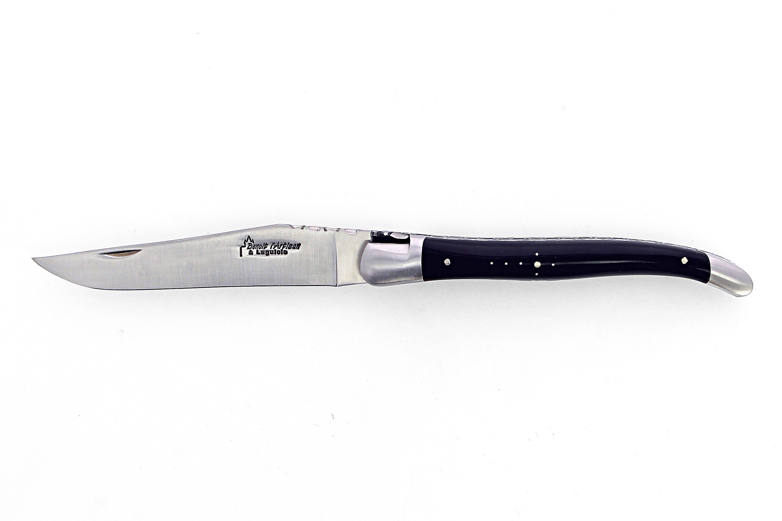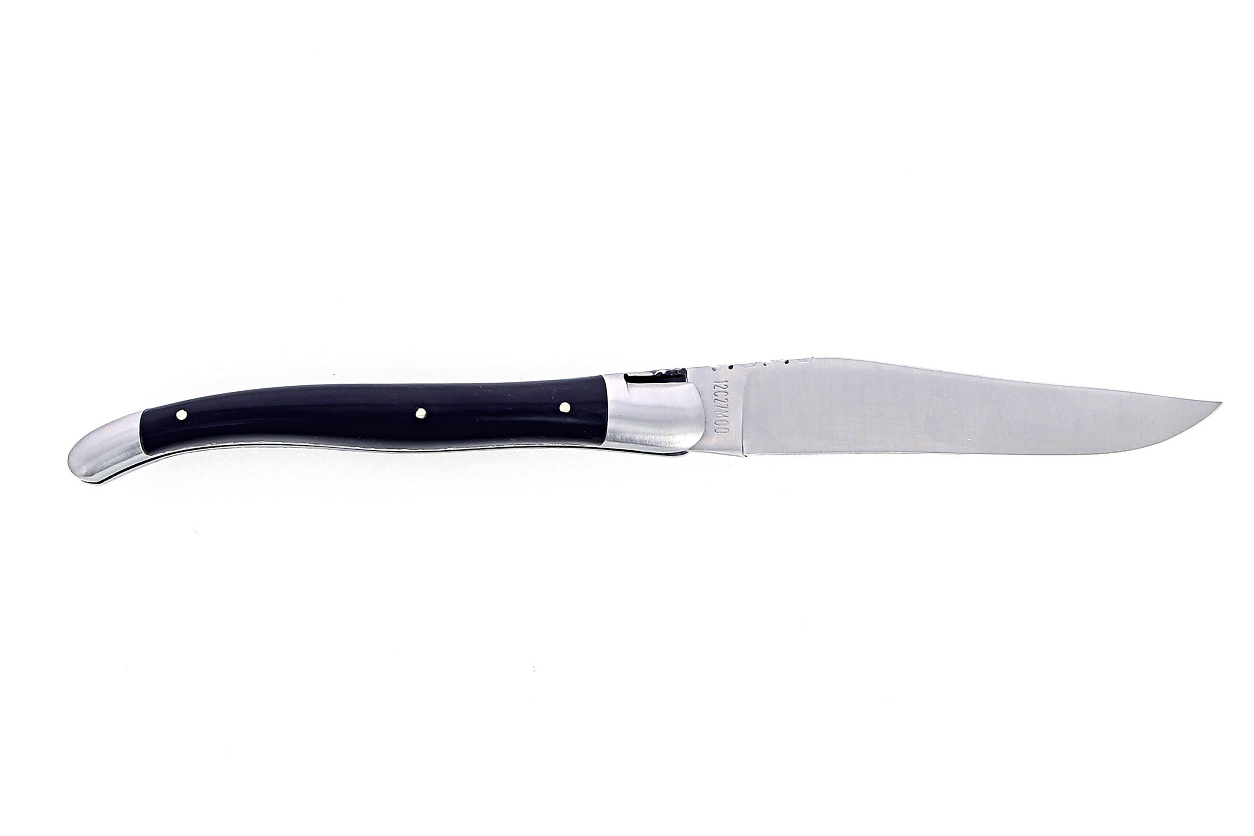 Laguiole pliant doubles platines, 13 cm, manche en corne massive noire, mitres inox brossé