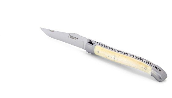 Ce couteau de Laguiole pliant doubles platines est doté d'un manche de 13 cm en os, protégé par deux mitres inox. L'os utilisé dans la confection de couteau de Laguiole provient de tibia de bœuf. Il offre une déclinaison de teintes variant autour du blanc cassé, apportant un rendu lumineux et élégant au couteau de Laguiole pliant.