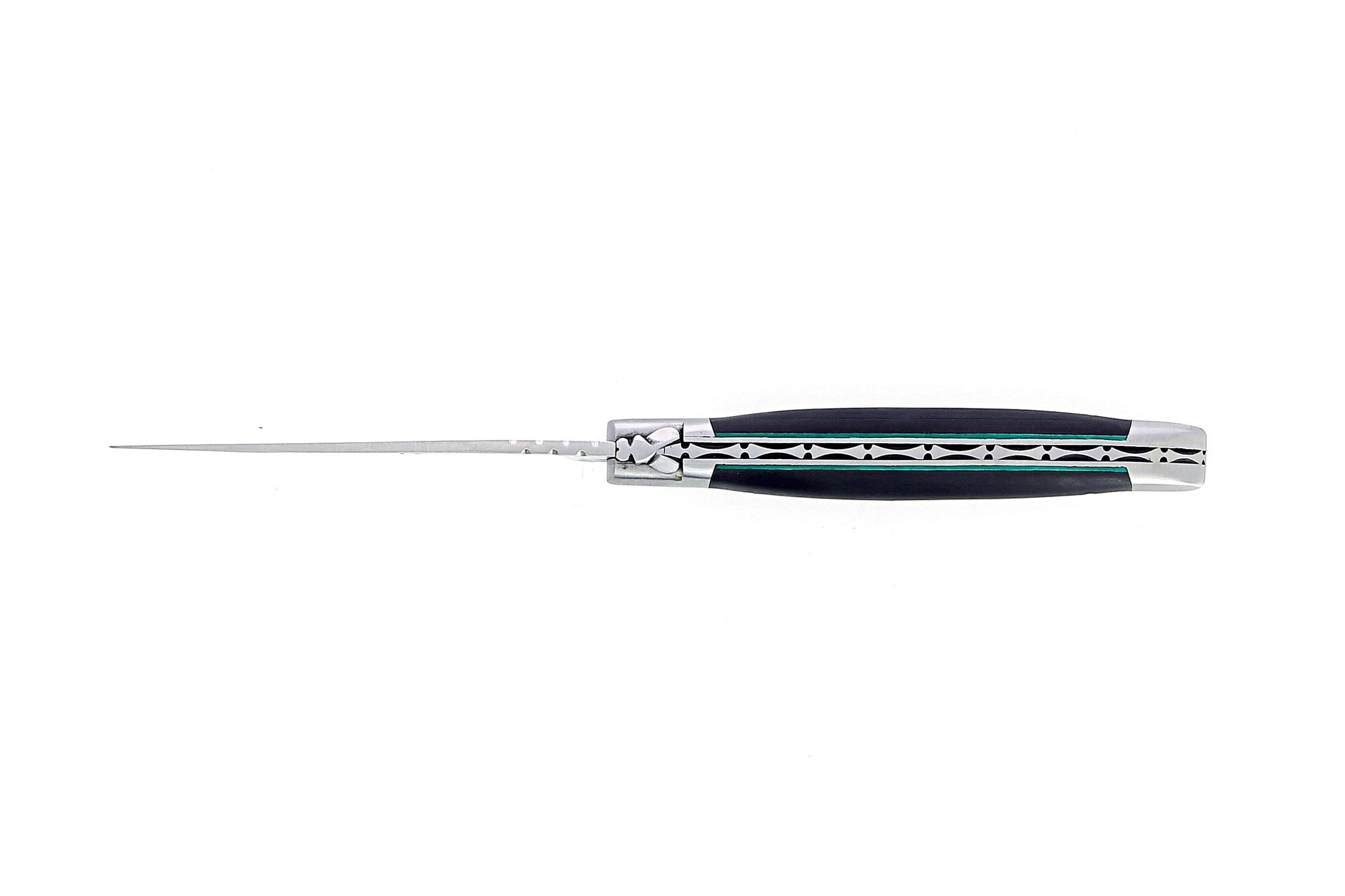 Laguiole pliant 12cm, manche en fibre de carbone, intercalaires verts, mitres inox brossées
