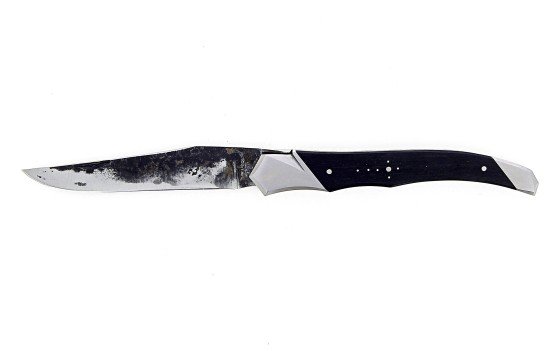La lame de ce couteau de Laguiole Tribal pliant de collection est dite "brute de forge", c'est-à-dire en acier carbone XC75, forgée à la main, tout comme pour les premiers modèles de couteaux de Laguiole. Ainsi, le forgeron a laissé les traces des coups de marteaux visibles sur le haut de la lame, en mémoire de la technique de forge artisanale utilisée.