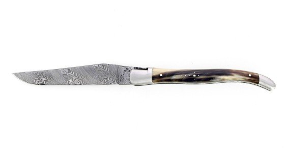 Ce couteau pliant de Laguiole doubles platines est doté d'un manche de 13 cm en corne massive blonde, protégé par deux mitres inox et d'une lame damas inox.