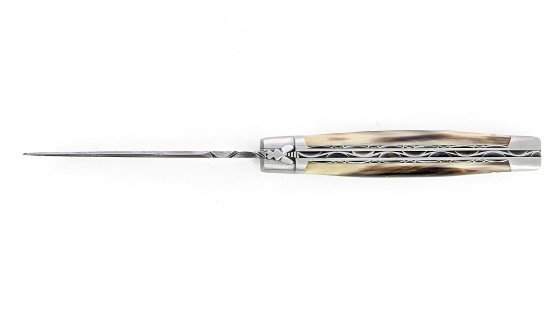 La lame Damas inoxydable de ce couteau de Laguiole pliant de collection a été forgée artisanalement au sein de notre atelier à Laguiole. L'acier Damas garantit une qualité de coupe exceptionnelle. Les lames Damas sont obtenues en soudant ensemble deux types d'aciers différents par chauffage et martelage. L'ensemble est ensuite à nouveau chauffé, étiré, replié sur lui-même et soudé, plusieurs fois, afin de multiplier les couches d'aciers. Les lames Damas artisanales que nous proposons comportent entre 46 et 92 couches d'acier offrant un motif riche et marqué.