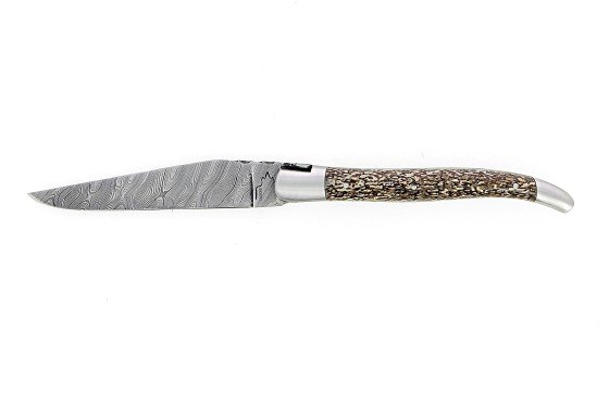 Ce couteau pliant de Laguiole doubles platines est doté d'un manche de 12 cm en os de dinosaure, protégé par deux mitres inox et d'une lame damas carbone.