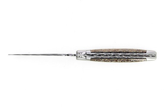 La lame Damas carbone de ce couteau de Laguiole pliant de collection a été forgée artisanalement au sein de notre atelier à Laguiole. L'acier Damas garantit une qualité de coupe exceptionnelle. Les lames Damas sont obtenues en soudant ensemble deux types d'aciers différents par chauffage et martelage. L'ensemble est ensuite à nouveau chauffé, étiré, replié sur lui-même et soudé, plusieurs fois, afin de multiplier les couches d'aciers. Les lames Damas artisanales que nous proposons comportent entre 46 et 92 couches d'acier offrant un motif riche et marqué.