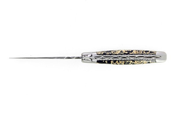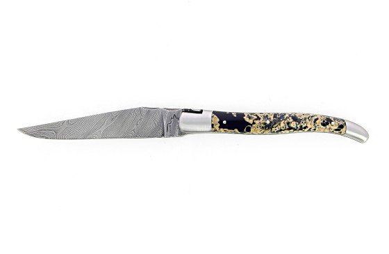 Ce couteau pliant de Laguiole doubles platines est doté d'un manche de 12 cm en pierre de lave, protégé par deux mitres inox et d'une lame damas carbone.