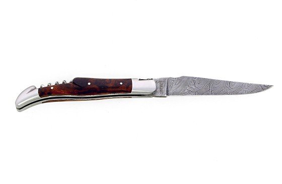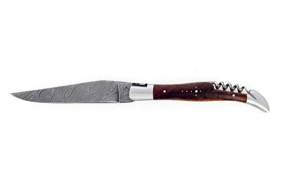 Ce couteau pliant de Laguiole avec tire-bouchon doubles platines est doté d'un manche de 12 cm en bois de fer, protégé par deux mitres inox et d'une lame Damas carbone.