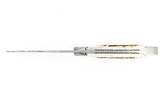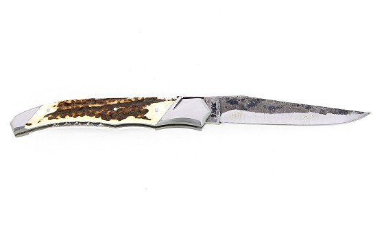 Ce couteau de Laguiole Tribal pliant est doté d'un manche de 12 cm en bois de cerf protégé par deux mitres inox, et de platines guillochées. Chaque année, à l'automne, les cerfs perdent leur bois. Certains sont ainsi récupérés pour confectionner le manche de couteau Laguiole pliant. Le bois de cerf est caractérisé par sa forme tout en relief. Il présente une croûte brune profondément nervurée, tranchant avec le beige du cœur du bois, donnant ainsi un aspect rustique au couteau Laguiole pliant.