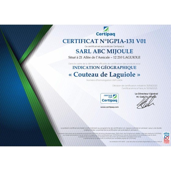 Nous nous engageons à respecter les normes de l'Indication Géographique - Couteau de Laguiole en assurant un suivi et une numérotation unique de chaque couteau estampillé "IG Couteau de Laguiole".