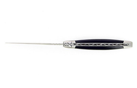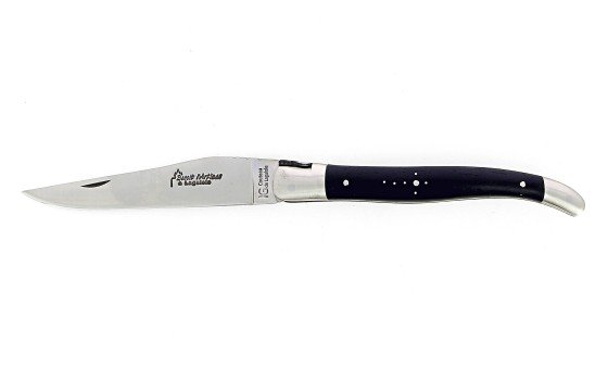 Ce couteau de Laguiole pliant est doté d'un manche de 12 cm en ébène, d'une abeille forgée et protégé par deux mitres inox. Le bois d'ébène est caractérisé par sa couleur noire. Son importante densité en fait un bois particulièrement résistant.