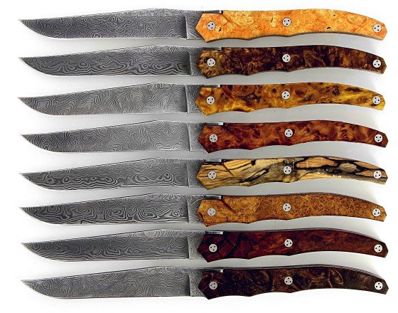 Ce coffret contient huit couteaux de table Laguiole Tribal Prestige dotés de pleins manches en loupes d'amboine, acacia, marronnier, thuya, hêtre échauffé, érable Negundo, bois de fer et madrone. Chaque couteau possède une soie et une lame Damas inoxydable.