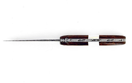 La lame Damas inoxydable de ce couteau de Laguiole pliant de collection a été forgée artisanalement au sein de notre atelier à Laguiole. L'acier Damas garantit une qualité de coupe exceptionnelle. Les lames Damas sont obtenues en soudant ensemble deux types d'aciers différents par chauffage et martelage. L'ensemble est ensuite à nouveau chauffé, étiré, replié sur lui-même et soudé, plusieurs fois, afin de multiplier les couches d'aciers. Les lames Damas artisanales que nous proposons comportent entre 46 et 92 couches d'acier offrant un motif riche et marqué.