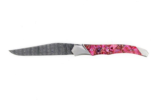 La lame Damas inox de ce couteau de Laguiole pliant de collection a été forgée artisanalement au sein de notre atelier à Laguiole. L'acier Damas garantit une qualité de coupe exceptionnelle. Les lames Damas sont obtenues en soudant ensemble deux types d'aciers différents par chauffage et martelage. L'ensemble est ensuite à nouveau chauffé, étiré, replié sur lui-même et soudé, plusieurs fois, afin de multiplier les couches d'aciers. Les lames Damas artisanales que nous proposons comportent entre 46 et 92 couches d'acier offrant un motif riche et marqué.