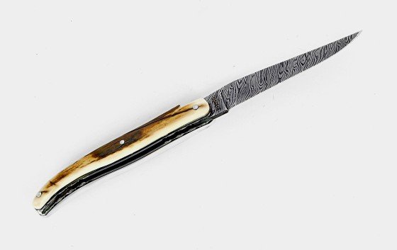 La lame Damas carbone de ce couteau de Laguiole pliant de collection a été forgée artisanalement au sein de notre atelier à Laguiole. L'acier Damas garantit une qualité de coupe exceptionnelle. Les lames Damas sont obtenues en soudant ensemble deux types d'aciers différents par chauffage et martelage. L'ensemble est ensuite à nouveau chauffé, étiré, replié sur lui-même et soudé, plusieurs fois, afin de multiplier les couches d'aciers. Les lames Damas artisanales que nous proposons comportent entre 46 et 92 couches d'acier offrant un motif riche et marqué.